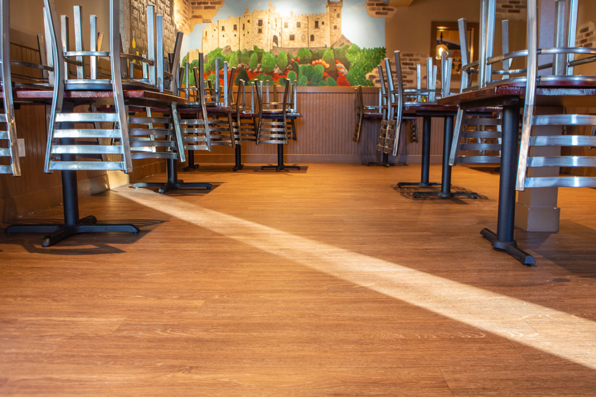 Installation of flooring throughout Angelo’s including base and transitions.